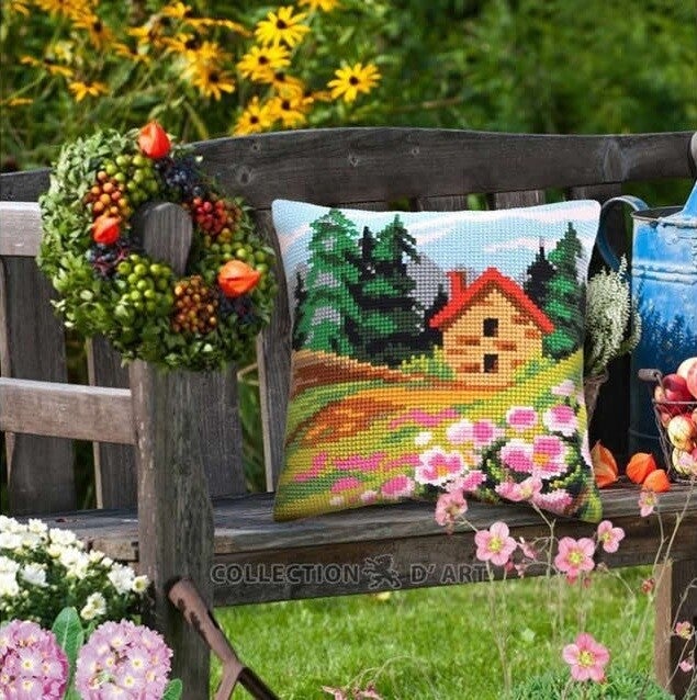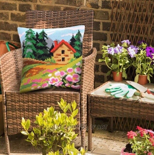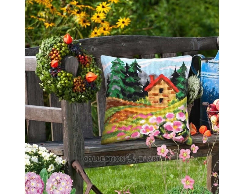 Kruissteek kussen borduurpakket op voorbedrukt canvas.