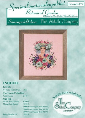 Pakketje met de originele Mill Hill kralen, Kreinik glittergarens en Waterlilies zijdegarens voor patroon md-177.