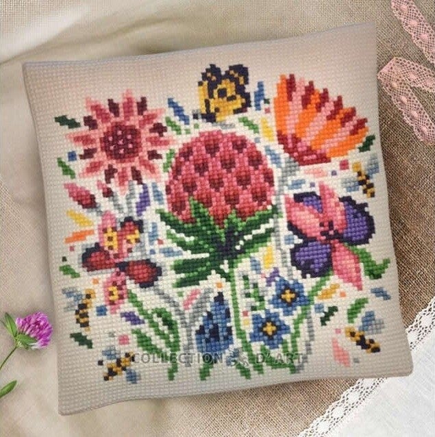 Kruissteek kussen borduurpakket op voorbedrukt canvas.