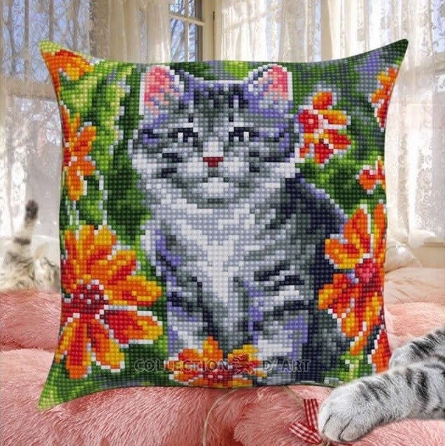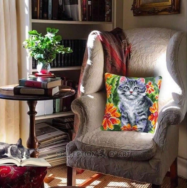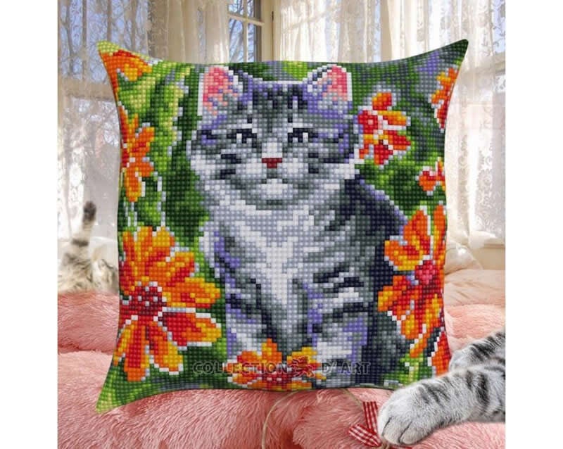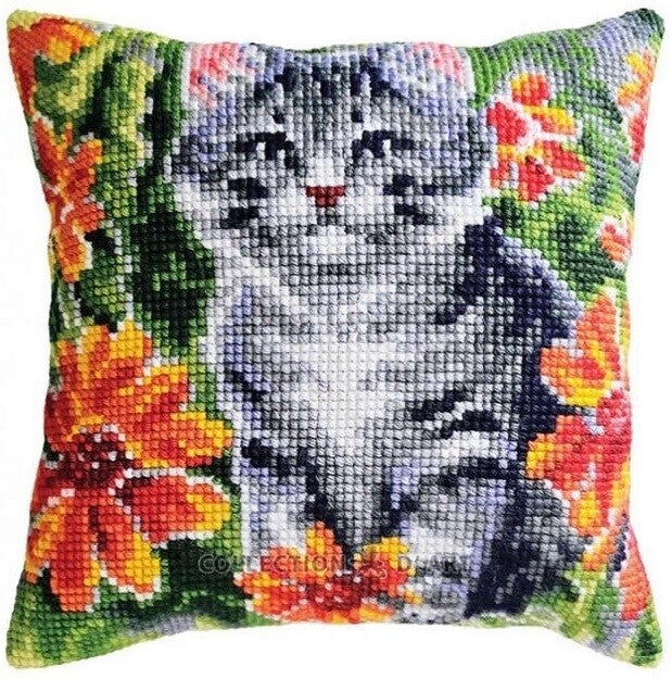 Uittel kruissteek kussen borduurpakket op blanco canvas, inclusief gekleurd telpatroon.
