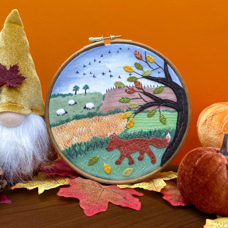 Dit vilten borduurpakket is gemaakt met een mix van wolvilt op in kleur bedrukt calico met voorgesorteerd 6-draads borduurgaren. Er wordt gebruik gemaakt van een verscheidenheid aan creatieve steken. Het pakket bevat ook een naald en een borduurring van 15 cm.
