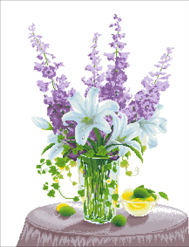 Voorbedrukt Borduurpakket - Lillies & Hollyhocks